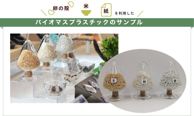 「卵の殻」「米」「紙」を利用したバイオマスプラスチックのサンプルと、