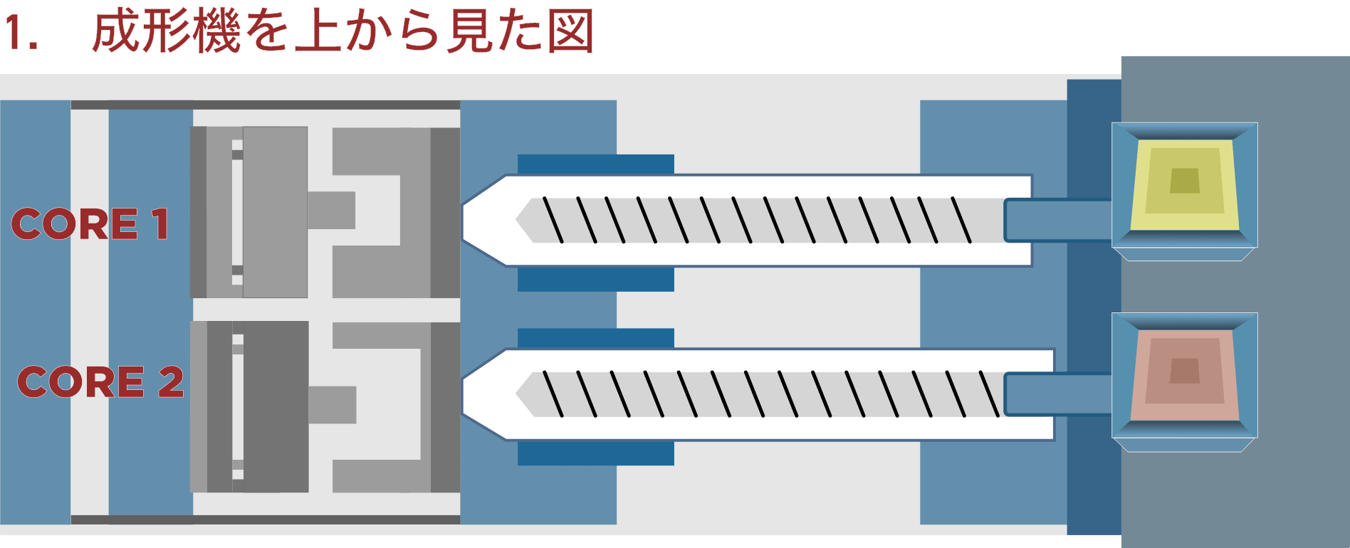 2色成形機は、2つの射出ユニットと金型から構成され、金型が回転しながら成形を行うことで、製品が作り出されます。