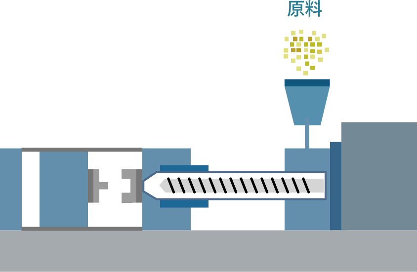 原料(ペレット状の樹脂)をホッパーから射出成形機へ供給します。